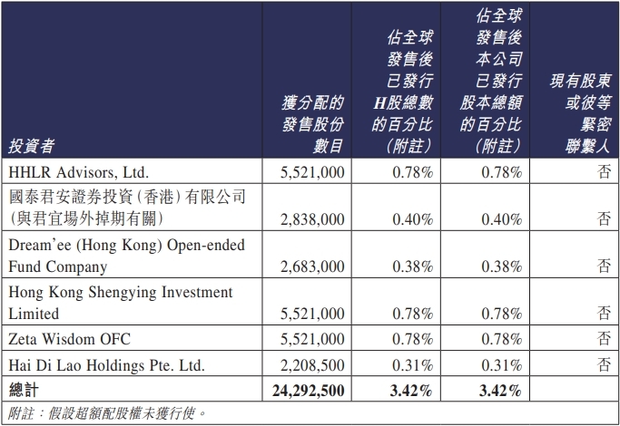 最终发售价及分配结果公告显示,遇见小面的基石投资者为HHLR Advisors, Ltd.、国泰君安证券投资(香港)有限公司(与君宜场外掉期有关)、Dream’ee (Hong Kong) Open-endedFund Company、Hong Kong Shengying Investment Limited、Zeta Wisdom OFC、Hai Di Lao Holdings Pte. Ltd.,获分配的发售股份数目分别为5,521,000股股份、2,838,000股股份、2,683,000股股份、5,521,000股股份、5,521,000股股份、2,208,500股股份,占全球发售后已发行H股总数的百分比分别为0.78%、0.40%、0.38%、0.78%、0.78%、0.31%,占全球发售后本公司已发行股本总额的百分比分别为0.78%、0.40%、0.38%、0.78%、0.78%、0.31%。