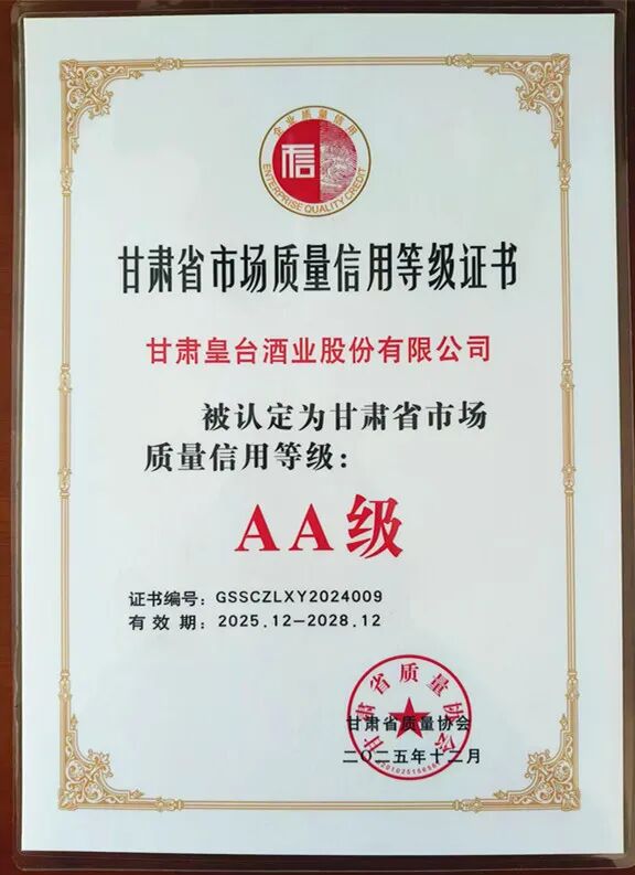 此次荣获“甘肃省市场质量信用等级评价AA级企业”,是对皇台酒业长期以来坚持诚信经营、注重产品质量的充分肯定。今后,皇台酒业将继续秉承诚信经营的理念,视产品质量为企业的生命线,为消费者提供更加优质和安全的皇台酒,为公司可持续发展提供有力保障,为推动行业诚信建设和社会信用体系建设贡献更多力量。