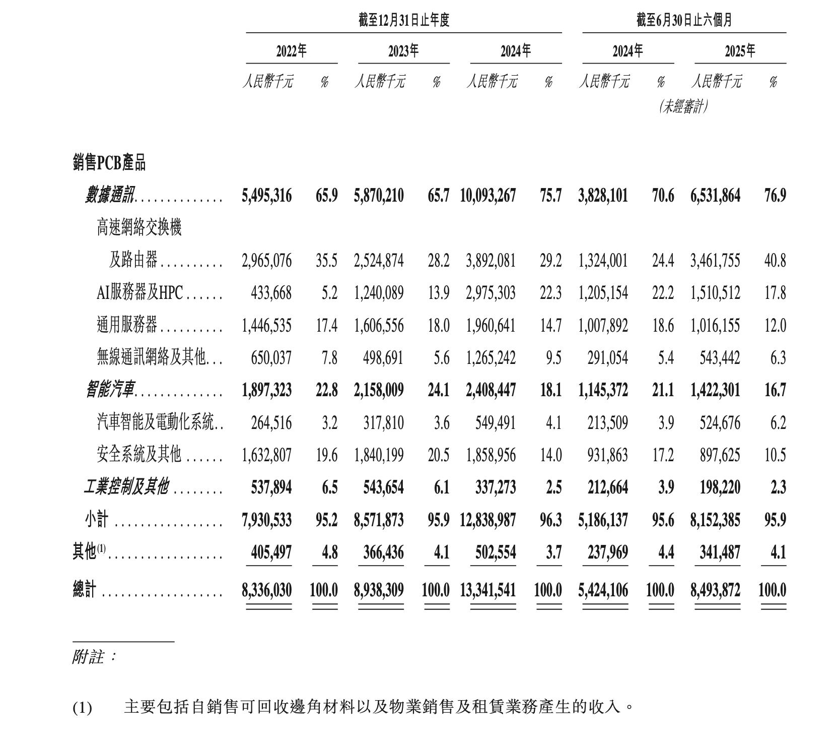 其中,数据通讯分部为公司的最主要营收来源,持续贡献七成左右的收入。根据财务数据显示,2022年至2024年,数据通讯业务收入分别为54.95亿元(人民币,下同)、58.70亿元和100.93亿元,占总营收比重由65.9%上升至75.7%,成为驱动公司业绩增长的核心引擎。尤其在2024年,随着AI服务器与高性能计算(HPC)需求爆发,AI服务器及HPC相关PCB收入达29.75亿元,同比增长133.6%,相关比重提升至22.4%;高速网络交换机及路由器收入亦保持稳健增长,达38.92亿元,占比29.2%。