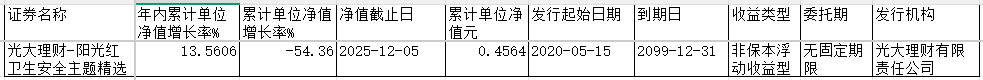 同花顺(300033)数据显示,阳光红卫生安全主题精选截至2025年12月5日,累计单位净值为0.4564元,累计单位净值增长率为-54.36%,其发行起始日期为2020年5月15日,为无固定期限非保本浮动收益型理财产品。