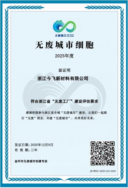 为深入贯彻落实国家生态文明战略,积极响应《金华市全域“无废城市”建设实施方案(2022—2025年)》(金政办发〔2022〕41号)文件精神,今飞新材料主动对接省级战略部署,积极投身“无废细胞”创建行动,于2025年12月9日正式完成“无废工厂”申报,成功纳入金华市“无废细胞”体系,成为区域绿色低碳发展版图中的生动实践样本。
