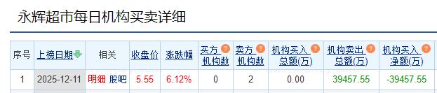 龙虎榜数据显示,卖出永辉超市金额最大的前五名中,有2家机构专用席位。经统计,机构席位今日卖出永辉超市净额为39457.55万元。