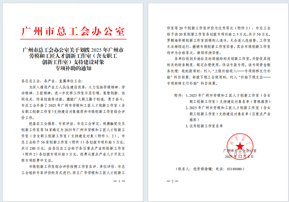 近日,广州市总工会公布了2025年广州市劳模和工匠人才创新工作室(含女职工创新工作室)支持建设对象及优秀等次名单。广电计量(002967)两大创新工作室喜获佳绩。其中,“陆裕东工匠人才创新工作室”被确定为市级支持建设对象,“张兰兰女职工创新工作室”获评市级“优秀创新工作室”。这两项荣誉,是对广电计量在产业工人队伍建设与技术创新领域长期投入与实践成效的积极肯定。