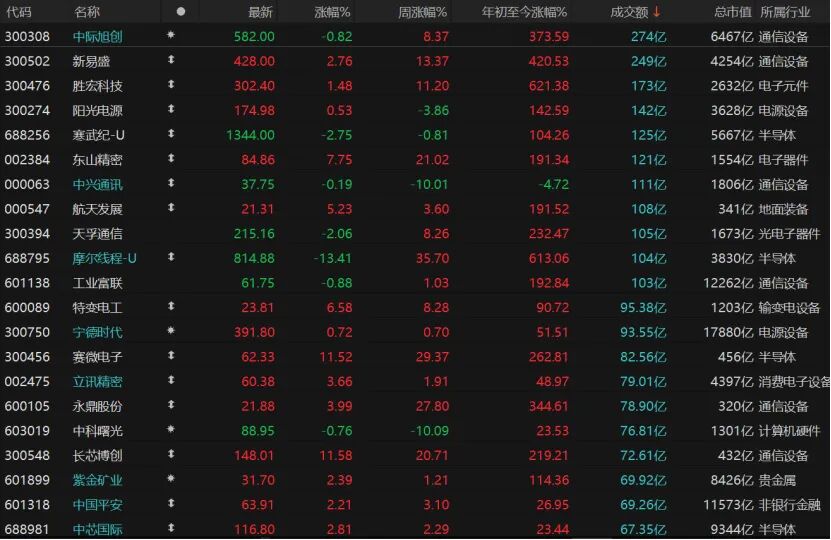 个股涨跌互现,2683只个股收涨,涨停股83只;2612只个股收跌,跌停股26只。CPO(共封装光学)概念龙头股“易中天”日成交额靠前,新易盛(300502)涨近3%,但中际旭创(300308)、天孚通信(300394)收跌。近日大涨的摩尔线程回调逾13%报814.88元/股。