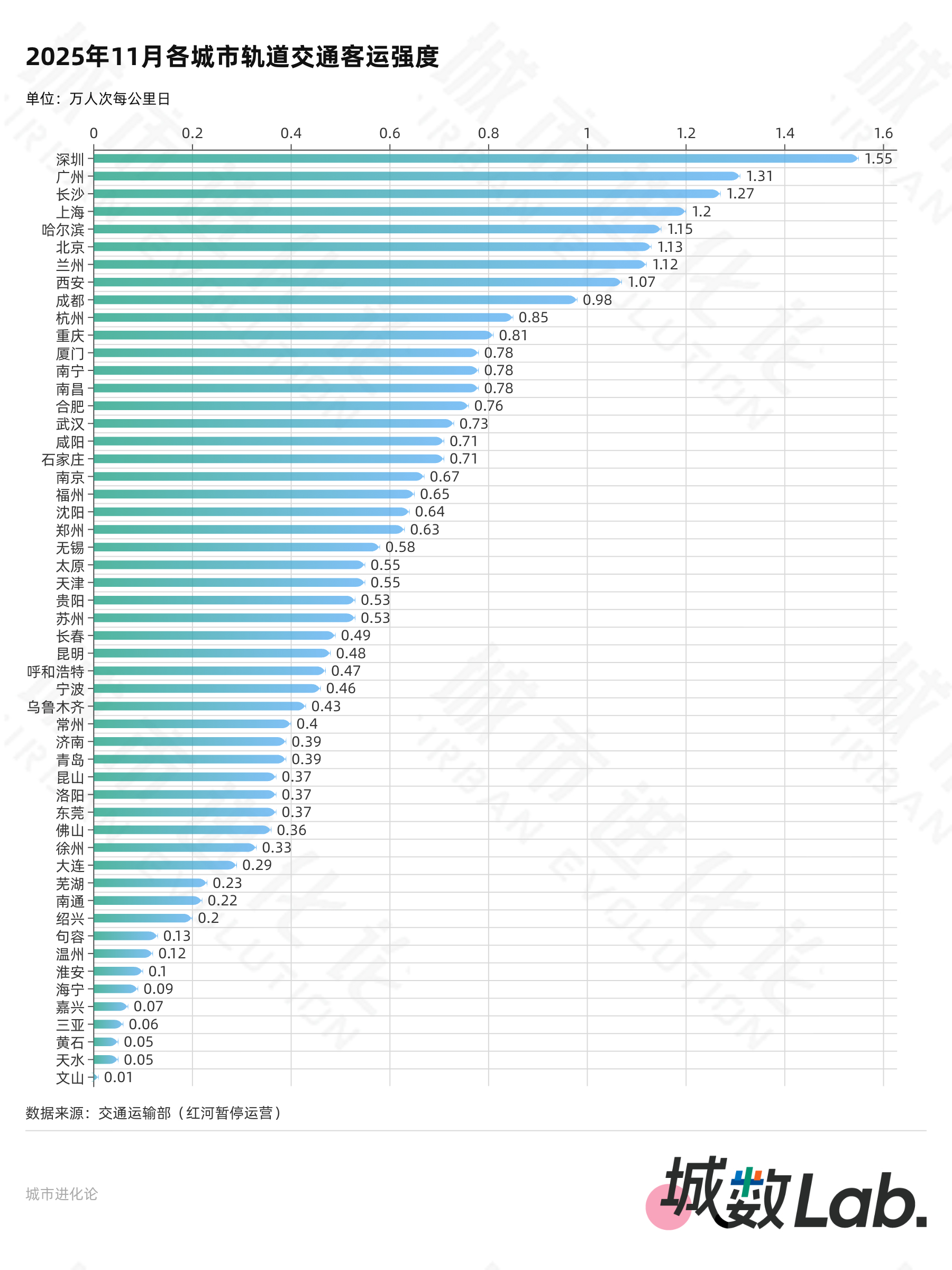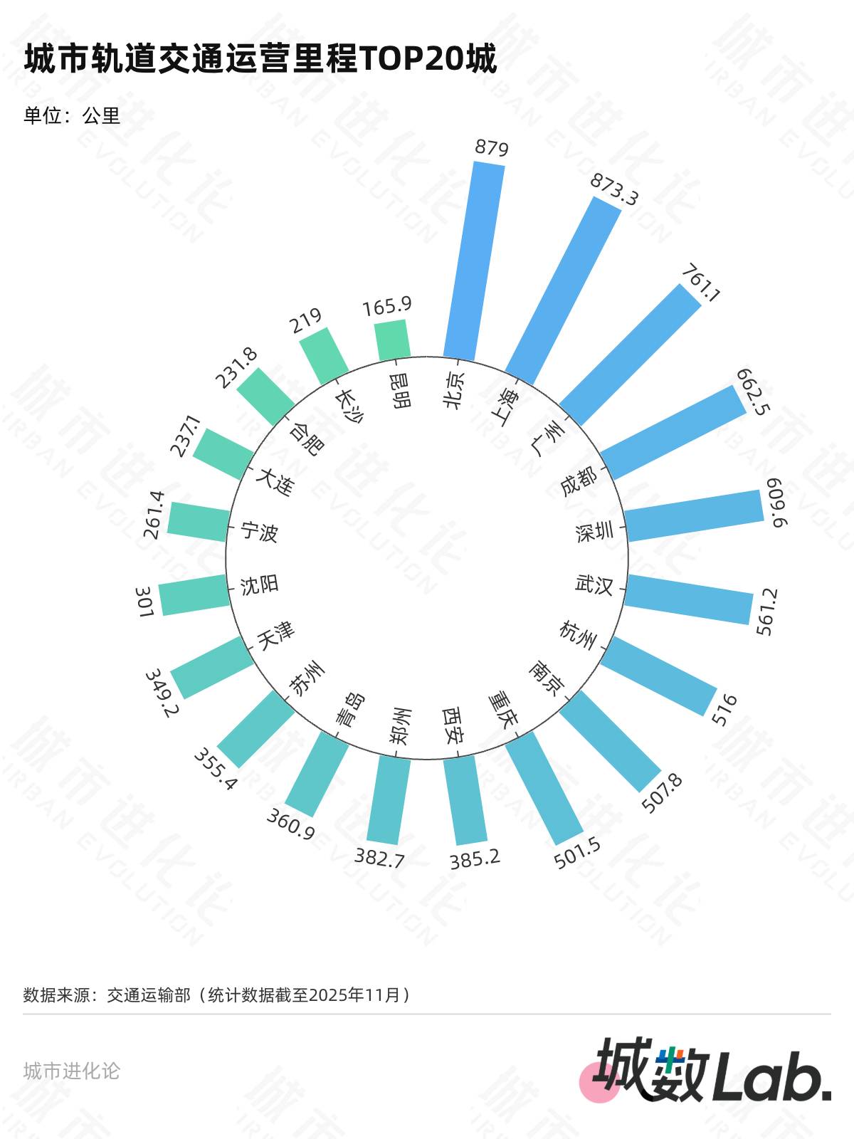 再看里程排位。截至今年11月,全国共54个城市开通运营城市轨道交通。其中,北京、上海、广州、成都、深圳稳居运营里程前五位,均超过600公里。相比2020年末,运营里程前十强成员仅有一席变动——西安反超青岛,跻身第十位。