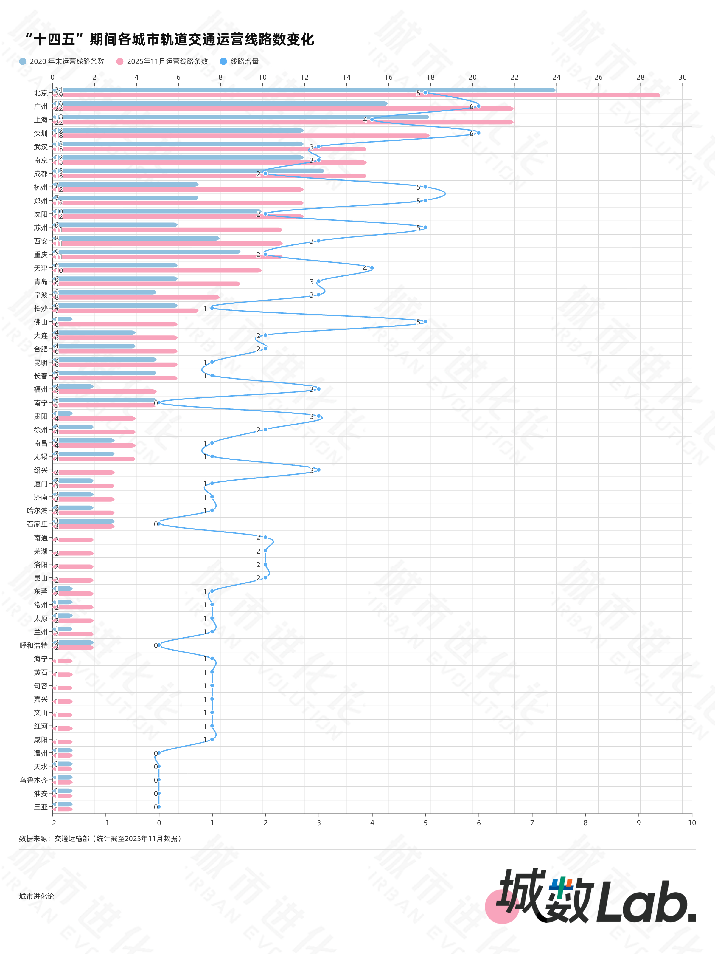 数据显示,2020年末至今年11月,全国新增10座城市开通运营城市轨道交通,线路增加近100条、运营里程增加3500多公里。具体来看,包括绍兴、南通、芜湖、洛阳等多个城市均实现零的突破。
