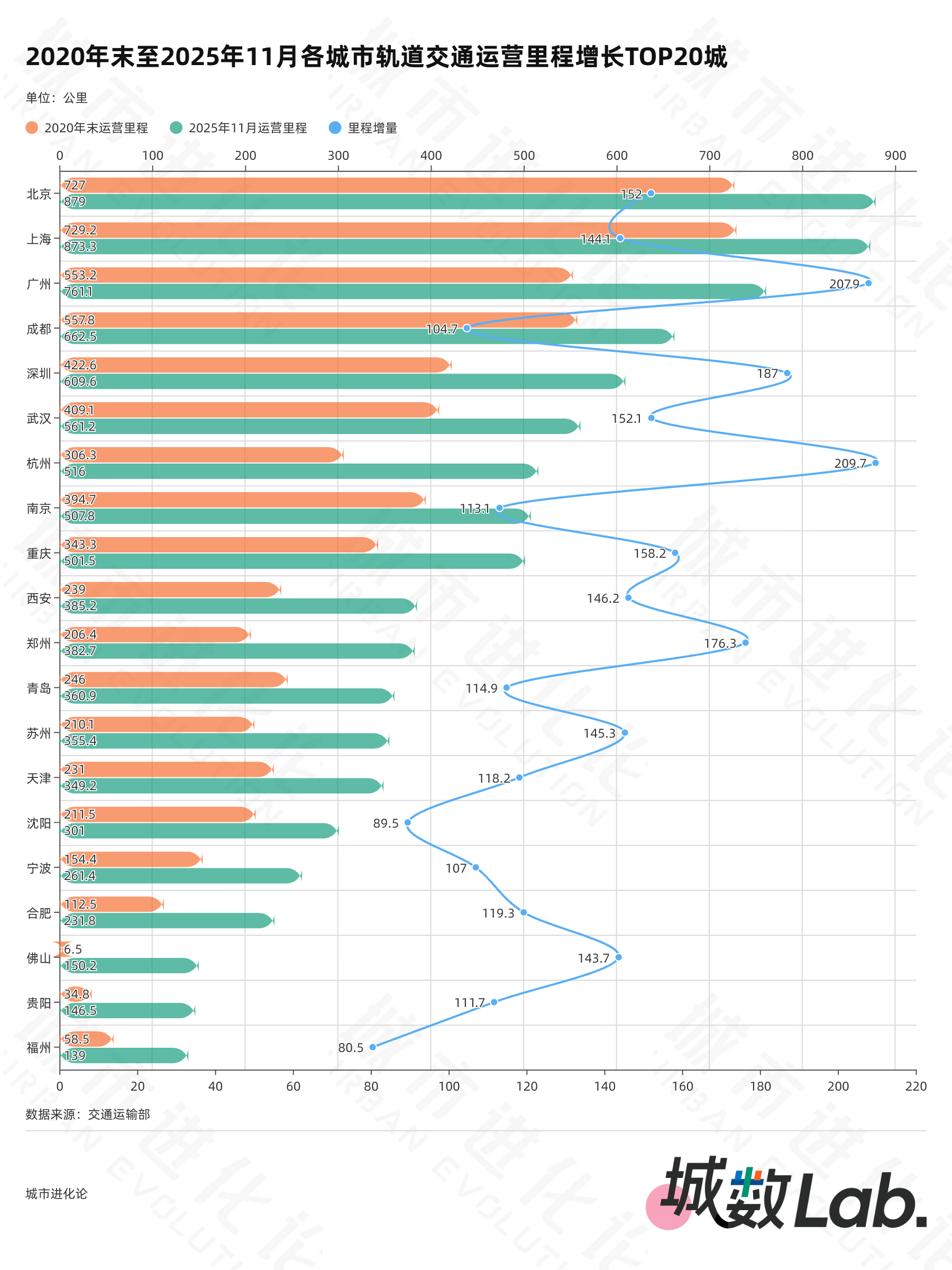 从五年里程变化看,目前杭州、广州以超200公里的增量位居前两位,深圳排名第三。不过广州在今年迎来爆发期,继9月底创下“五线齐开”新历史之后,预计年底前还将新开通地铁22号线后通段、广清城际铁路南延段两段线路。这意味着,广州有望在“十四五”最后时刻反超杭州、冲刺里程增量第一的席位。
