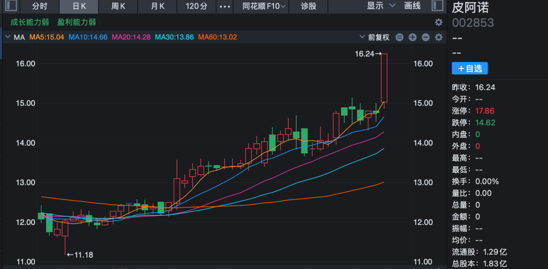 该公司主要从事中高端定制橱柜、衣柜、门墙及其配套家居产品的研发、设计、生产、销售、安装与售后等服务。停牌前,皮阿诺临近尾盘时拉升涨停,收于16.24元/股,市值约30亿元。