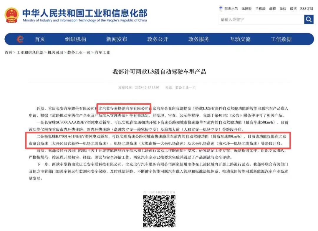 12月15日,北汽新能源旗下极狐阿尔法S(L3版)正式获批自动驾驶车型产品准入许可,即将在北京市限定区域内开展L3级有条件自动驾驶上路通行试点。这标志着我国自动驾驶技术发展逐步走向量产应用阶段,也是北汽新能源在自动驾驶领域从技术验证阶段迈向量产应用阶段的重要里程碑。