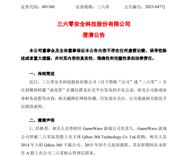 晚间,三六零就相关内容发布澄清公告表示,经核查,相关人员曾担任GameWave游戏公司负责人,GameWave游戏公司曾被三六零原美股上市主体Qihoo 360 Technology Co. Ltd.收购。相关人员2014年入职Qihoo 360下属公司,2015年因个人原因离职。其在职期间从未担任A股上市公司三六零核心管理层职务。