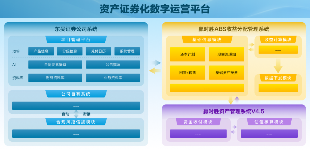 经过近一年紧密合作,赢时胜与东吴证券从业务实际场景出发,系统梳理并重构存续期管理流程,构建起以自动化计算为核心、与东吴证券“资产证券化数字运营平台”无缝衔接的数字运营体系。