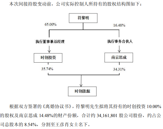 根据《离婚协议书》,符黎明将持有的南京时创创业投资有限公司(时创投资)10%股权及南京思成创业投资合伙企业(南京思成)14.48%财产份额转移至王彦肖名下,合计涉及时创能源股份约3416.18万股,占公司总股本的8.54%。本次变动后,符黎明仍为公司实际控制人,公司控制权结构未发生变更。