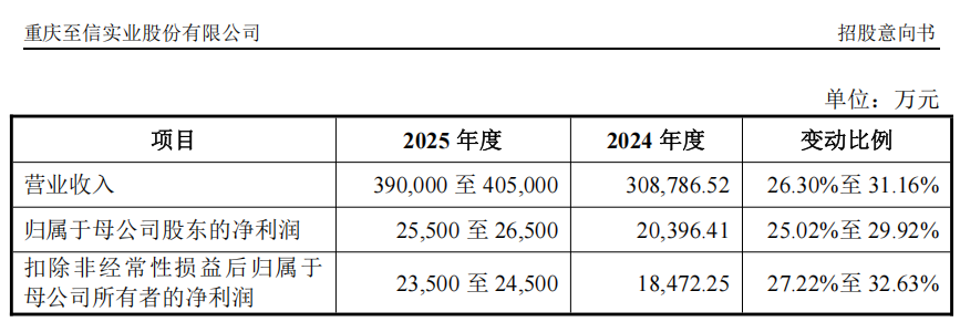 招股意向书显示,基于目前的经营状况和市场环境,至信股份(603352)预计其2025年的营业收入为39.00亿元至40.50亿元,同比增长26.30%至31.16%;归母净利润为2.55亿元至2.65亿元,同比增长25.02%至29.92%。