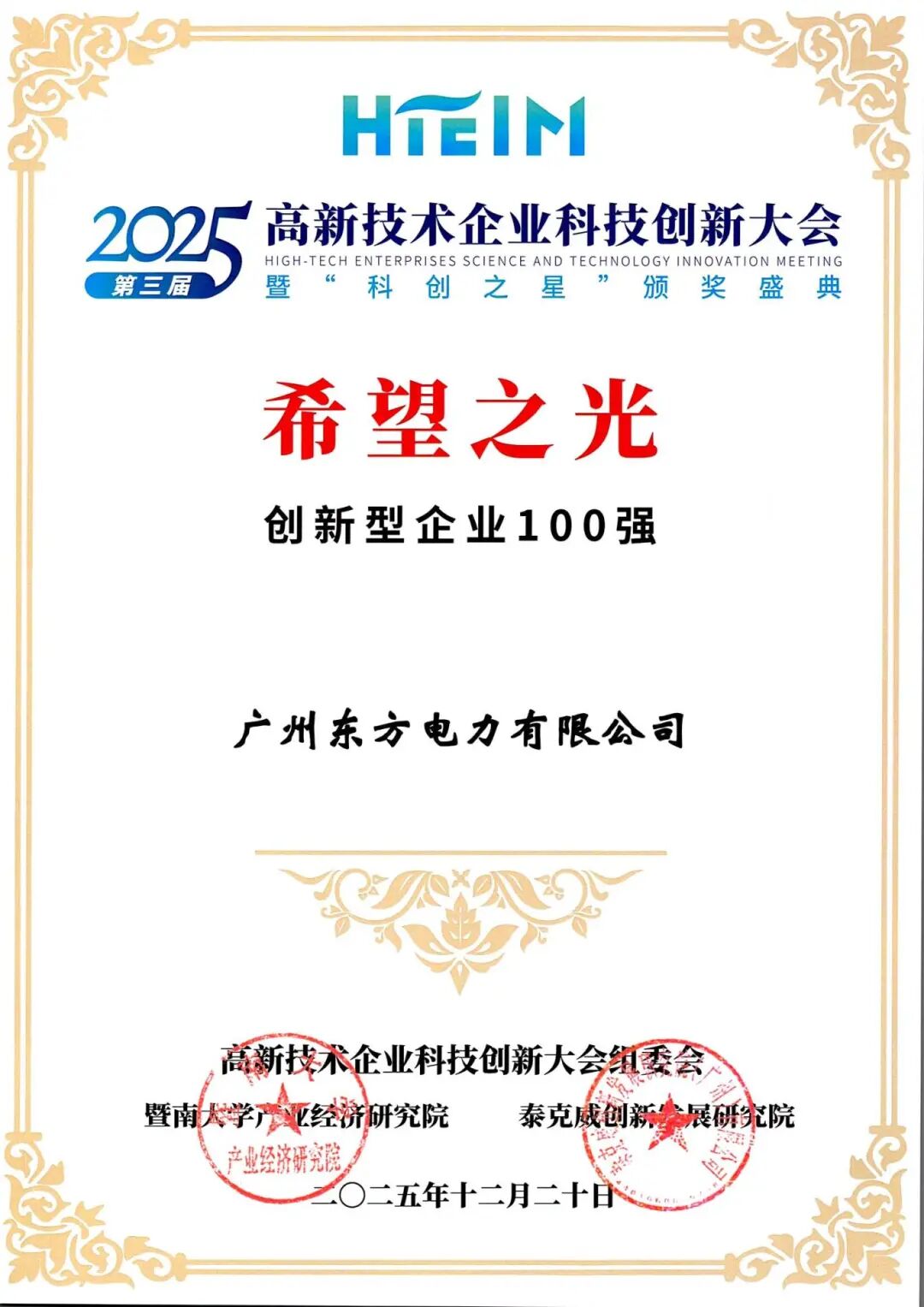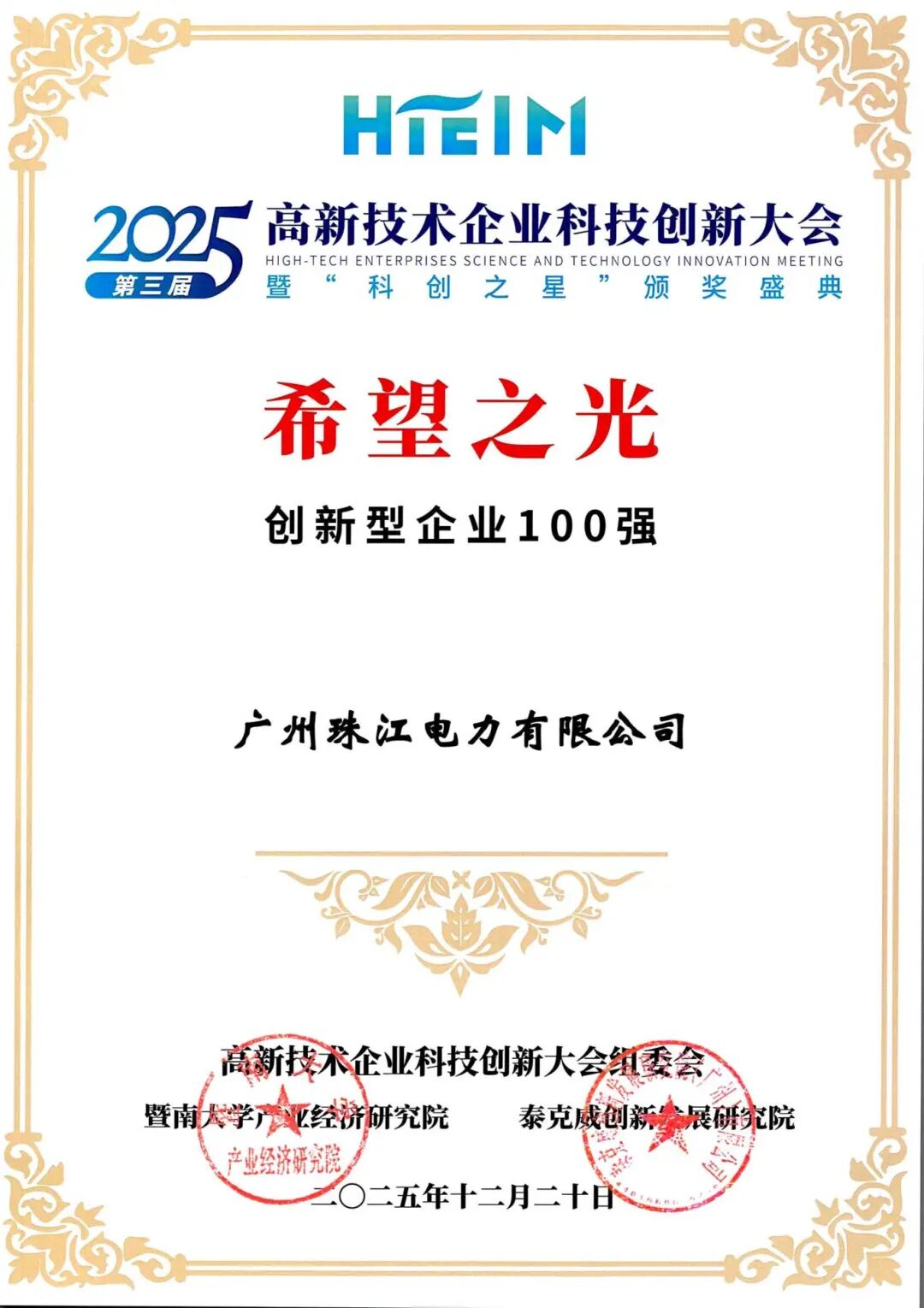 在本次评选中,广州珠江电力有限公司与广州东方电力有限公司荣膺“希望之光”创新型企业100强称号,充分彰显了企业在技术创新、产业赋能等方面的突出成就;杨钊铭同志凭借在科技创新工作中的卓越表现,获评“十大优秀科技工作者”。