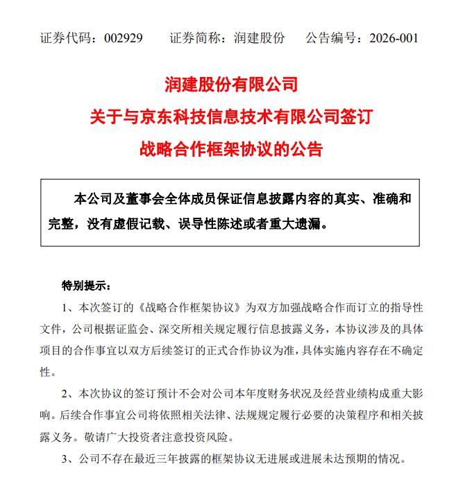 1月8日,润建股份(002929)公告称,公司与京东(JD)科技于2026年1月8日签署了《战略合作框架协议》,双方将围绕AI应用、智算云拓展、智算AIDC合作等多领域开展合作,促进AI技术商业化应用。