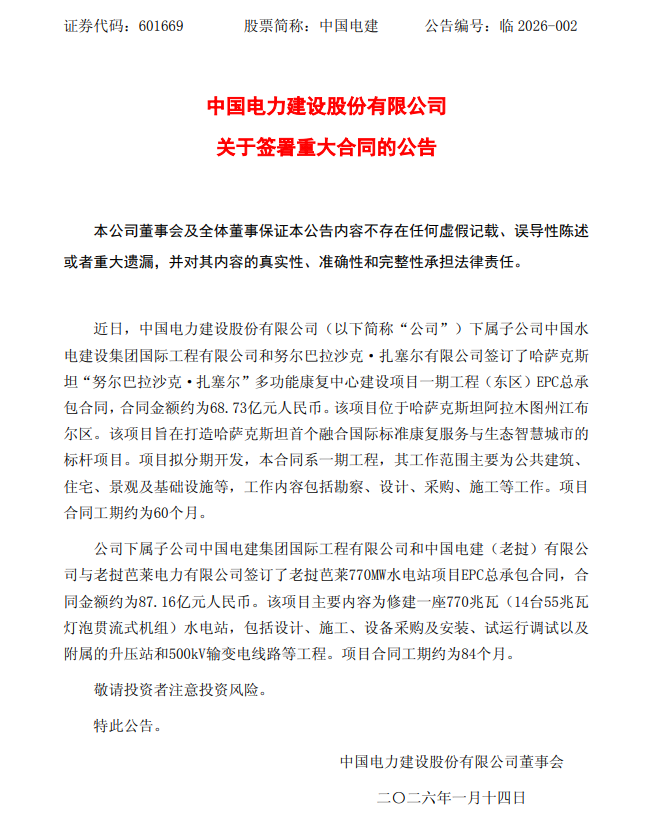 1月13日,中国电建(601669)(601669.SH)公告称,下属子公司中国水电建设集团国际工程有限公司和努尔巴拉沙克.扎塞尔有限公司签订了哈萨克斯坦“努尔巴拉沙克.扎塞尔”多功能康复中心建设项目一期工程(东区)EPC总承包合同,合同金额约为68.73亿元人民币。下属子公司中国电建集团国际工程有限公司和中国电建(老挝)有限公司与老挝芭莱电力有限公司签订了老挝芭莱770MW水电站项目EPC总承包合同,合同金额约为87.16亿元人民币。两份合同总金额约155.89亿元人民币。