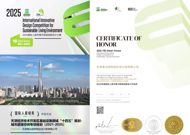 近日,泰达绿化所属泰达园林规划设计院凭借可持续设计领域的深厚积淀与创新实践,在国际人居环境可持续创新设计大赛中脱颖而出,一举斩获“2025年度国际人居环境可持续创新设计作品奖”两项金奖、一项银奖,成为本次大赛中极具影响力的中国代表。