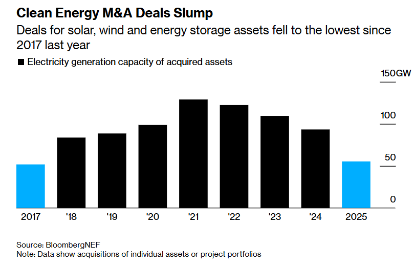 去年受特朗普政府贸易政策引发的清洁能源政策不确定性与全球金融市场剧烈波动带来的影响,更广泛的私募股权市场的退出节奏放缓。同时,根据数据BloombergNEF统计数据,涉及可再生能源公司交易的平均溢价在2025年降至大约12%,远远低于一年前的46%。