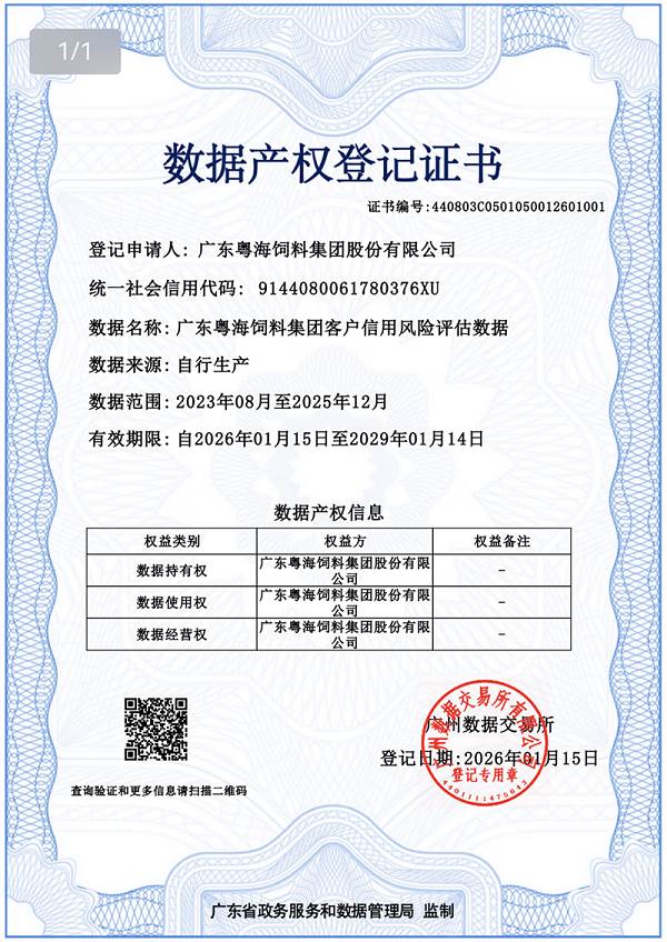 2026年1月14日,水产饲料行业迎来了具有里程碑意义的重大突破。广东粤海饲料(001313)集团股份有限公司(股票代码:001313.SZ)自主研发的“客户信用风险评估数据产品”经过广州数据交易所的严格审核,成功获得全国首张水产行业数据产权登记证书,并正式上线交易。这一历史性事件不仅标志着粤海饲料成为湛江地区首家获得数据产权登记的民营企业,更为整个水产行业开启了数据资产化的新时代,为行业的数字化转型注入了强大动力,紧密契合国家深化数据要素市场化配置的战略导向。