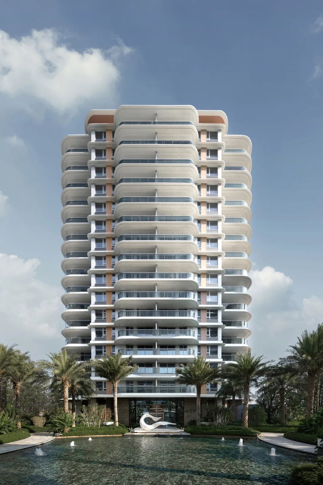 立足海棠湾度假属性,以低密高层布局与开放式公共空间,重塑“回归度假本质”的居住体验。曲线立面、下沉会所与270°全景阳台,让建筑与自然景观充分融合。