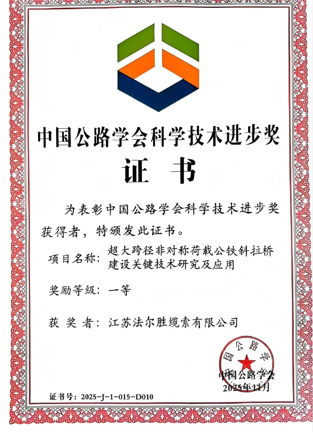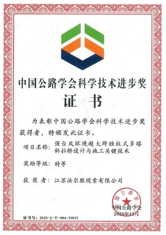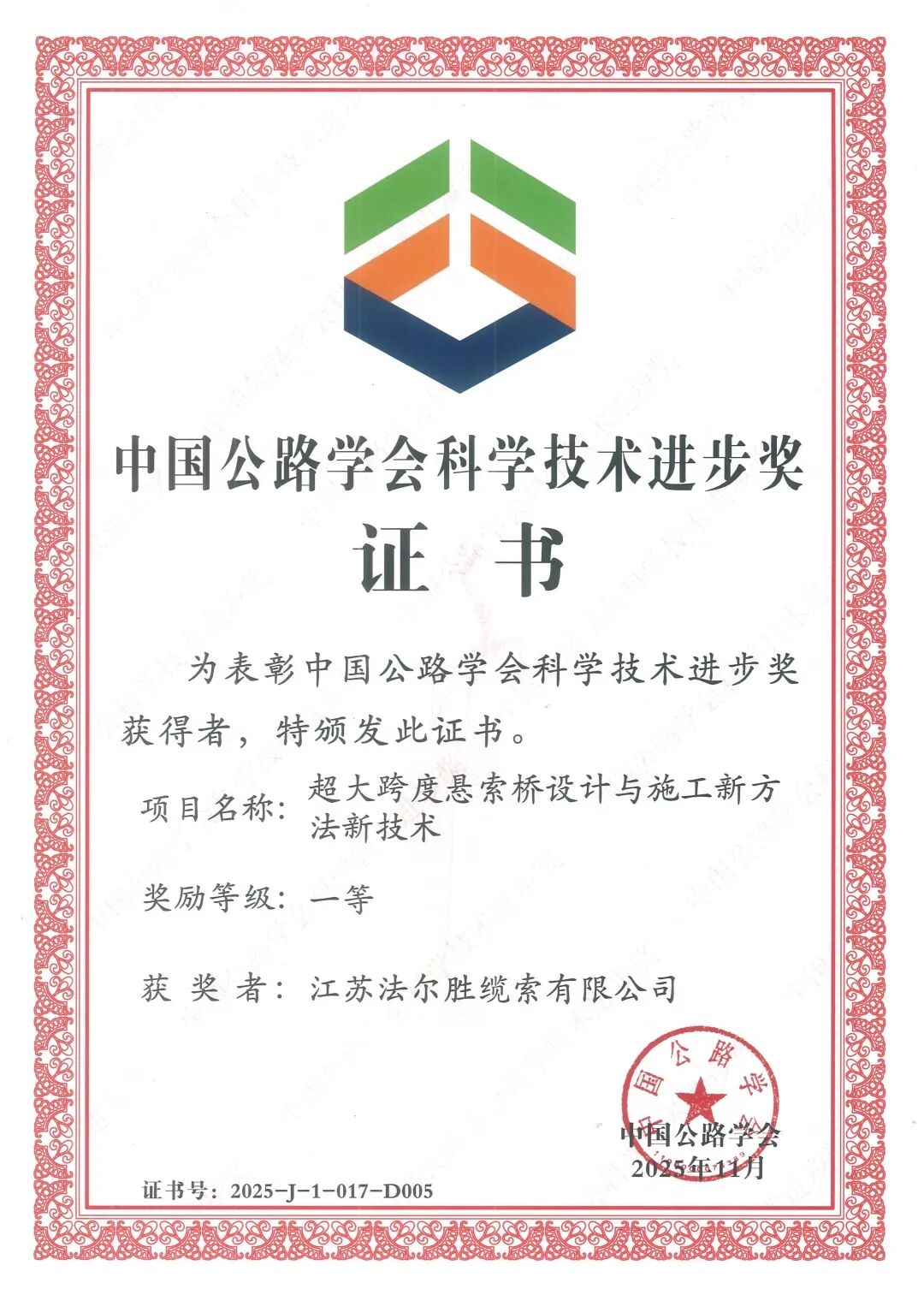 法尔胜缆索长期致力于桥梁缆索的研发与工程应用,参建了国内外多座标志性大型桥梁。此次多项成果获奖,是对公司坚持科技创新、服务国家交通强国战略的认可。