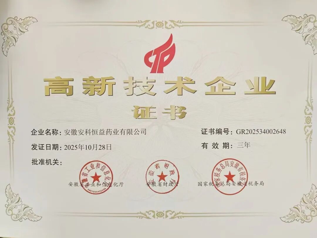 近日,安徽安科生物(300009)工程(集团)股份有限公司全资子公司安徽安科恒益药业有限公司顺利通过高新技术企业重新认定,并获得由安徽省工业和信息化厅、安徽省财政厅、国家税务总局安徽省税务局联合颁发的《高新技术企业证书》,证书编号GR202534002648,有效期三年。本次认定系安科恒益原高新技术企业证书有效期满后的重新认定,标志着安科恒益在技术创新、研发实力及成果转化等核心竞争力方面持续获得权威认可。