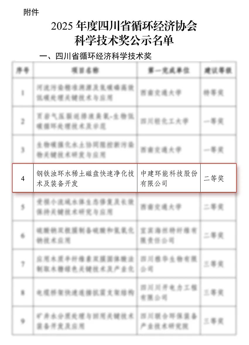 在本次评选中,中建环能申报的“钢铁浊环水稀土磁盘快速净化技术及装备开发”科技成果荣获四川省循环经济科学技术奖二等奖,“污泥大柔性高效干化与双循环热动耦合及智能控制关键技术”科技成果荣获四川省循环经济科学技术创新奖一等奖,标志着公司在钢铁煤炭、污泥干化两大核心业务场景的创新高度、技术成熟度与装备产业化能力得到了获得行业权威认可。