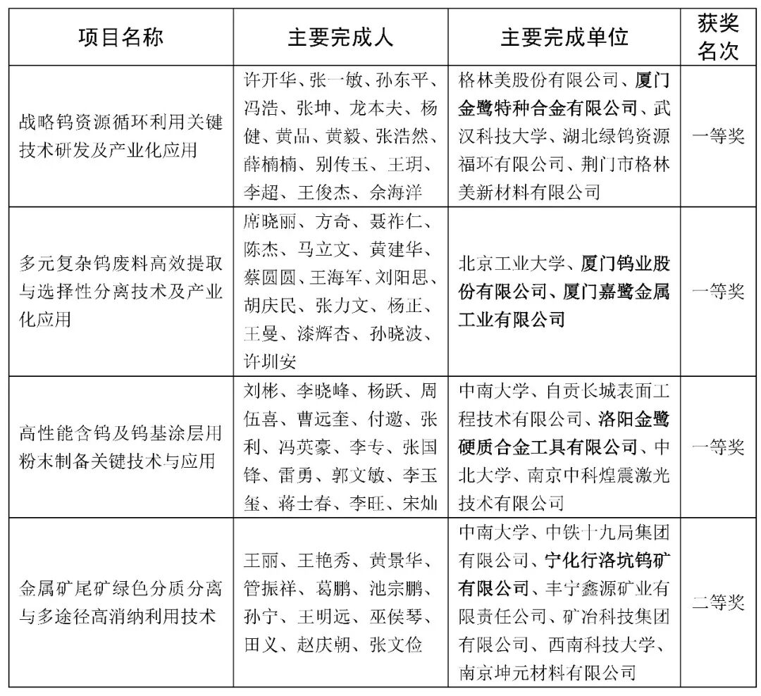 近日,中国有色金属工业协会、中国有色金属学会公布了2025年度有色金属工业科学技术奖获奖名单经统计,厦门钨业(600549)及权属企业共有4个项目榜上有名,其中,一等奖3项、二等奖1项。具体名单如下:
