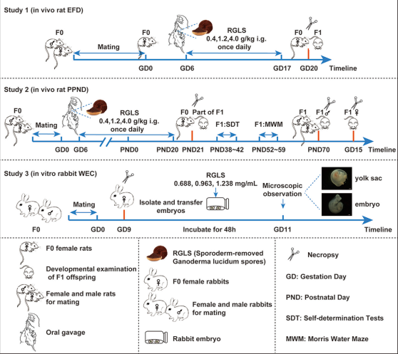 产前产后发育毒性实验(PPND):这是周期最长的实验,考察更为长远。从母鼠怀孕一直观察到它的宝宝(F1代)长大成年。目的是看去壁灵芝孢子粉会不会影响母鼠的哺乳,以及子代宝宝的生长发育、学习记忆能力,甚至长大后的生育能力。