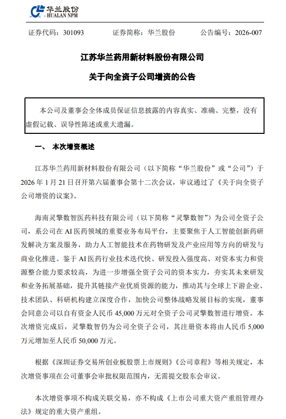1月21日,华兰股份(301093)公告称,海南灵擎数智医药科技有限公司(简称“灵擎数智”)为公司全资子公司,系公司在AI医药领域的重要业务布局平台,主要聚焦于人工智能(885728)创新药(886015)研发解决方案及服务,助力人工智能(885728)技术在药物研发及产业应用等方向的研发与商业化推进。鉴于AI医药行业技术迭代快、研发投入强度高、对资本实力和资源整合能力要求较高,为进一步增强全资子公司的资本实力,夯实其未来研发和业务拓展基础,提升其链接产业优质资源的能力,推动其与全球上下游企业、技术团队、科研机构建立深度合作,加快公司整体战略发展目标的实现,董事会同意公司以自有资金人民币4.5亿对全资子公司灵擎数智进行增资。本次增资完成后,灵擎数智仍为公司全资子公司,其注册资本将由人民币5,000万元增加至人民币5亿元。
