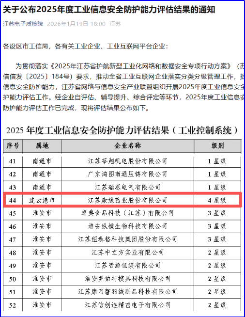 近日,江苏省网络与信息安全产业联盟秘书处联合江苏省电子信息产品质量监督检验研究院正式发布《2025 年度工业信息安全防护能力评估结果》。江苏康缘药业(600557)股份有限公司凭借体系完善的工业信息安全建设布局与卓越的工控安全防护实操能力,成功获评 “工业信息安全防护能力 4 星级企业”,成为江苏省医药行业内首家斩获该殊荣的企业。