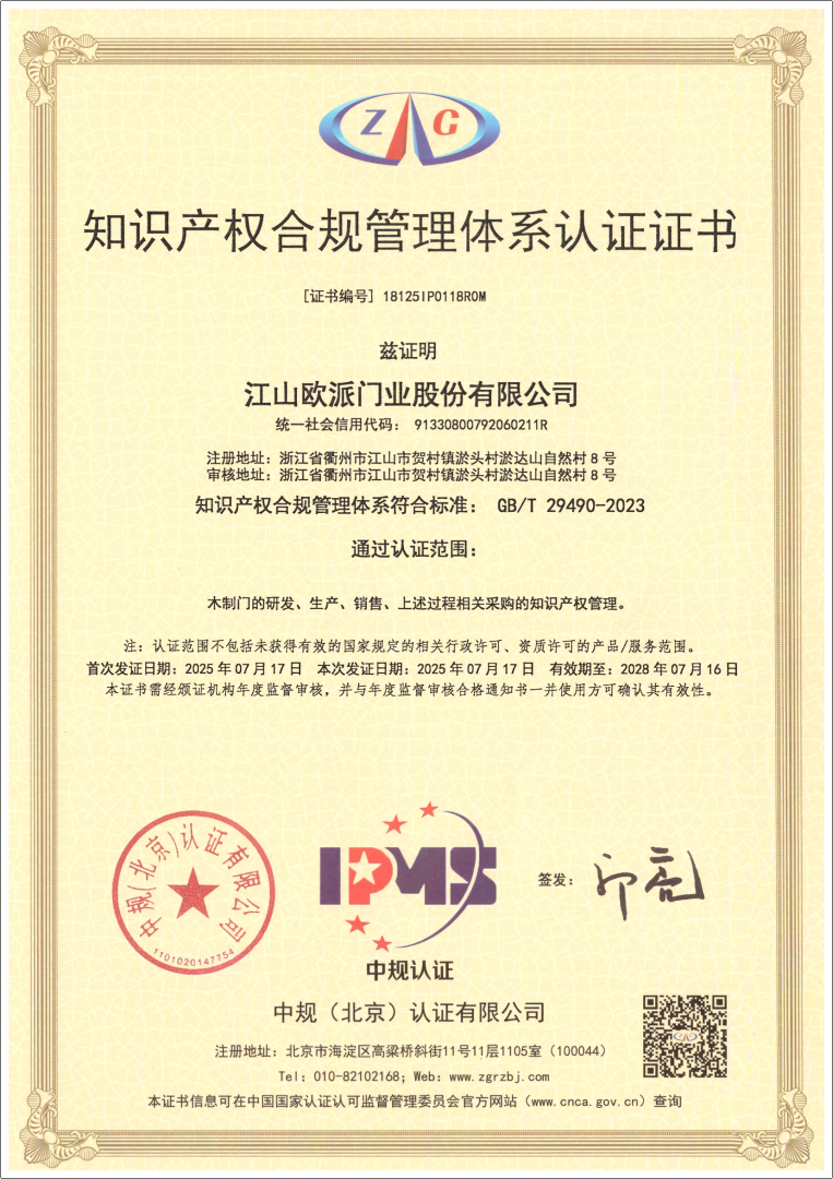 日前,江山欧派(603208)门业股份有限公司正式获得知识产权合规管理体系认证证书,认证范围全面覆盖木质门的研发、生产、销售及相关采购过程。这标志着江山欧派在技术创新与知识产权规范化、系统化管理方面迈入了全新阶段,为企业的可持续发展构筑了坚实的护城河。