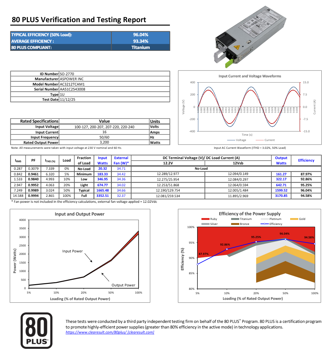 ASPOWER欧陆通 AC3212TCAM1采用1U紧凑机身设计,额定输出功率达3200W,输入规格支持100–127V及200–240Vac全球宽电压输入,额定输入电流16A。能效表现尤为亮眼,在230V工况下,5%/10%/20%/50%/100%负载点效率分别达87.97%/92.86%/95.25%/96.04%/94.58%,平均效率约93.34%,空载输入功耗仅20.32W,成功斩获80PLUS钛金认证。电源DC侧以12V母线为主并配备12Vsb待机输出,供电稳定性拉满。