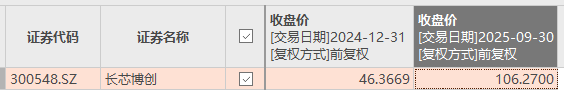数据显示,截至2025年9月30日,长芯博创(300548.SZ)的收盘价为106.27 元/股,相较于2024年年末的46.37元/股,增长幅度达到129.19%。