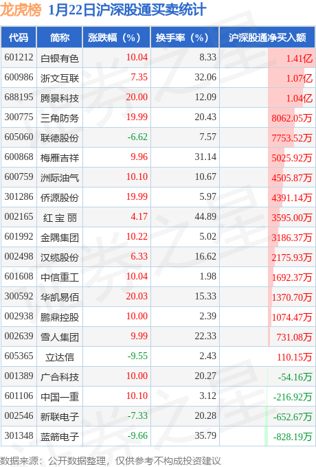 龙虎榜中有沪股通/深股通专用席位(北向资金)现身的个股共26家,其中白银有色(601212)、浙文互联(600986)、腾景科技分别居沪深股通净买入前三名。详情如下: