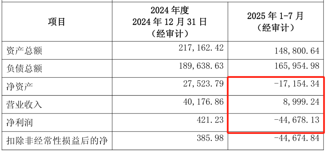 读创财经注意到,七彩公司2025年前7个月净利润出现了-4.47亿元的巨额亏损。截至2025年7月底,七彩公司的资产总额直接从2024年末的约21.72亿元降至约14.88亿元,降幅约31.5%,这导致七彩公司截至2025年7月末的净资产直接转至约-1.72亿元。