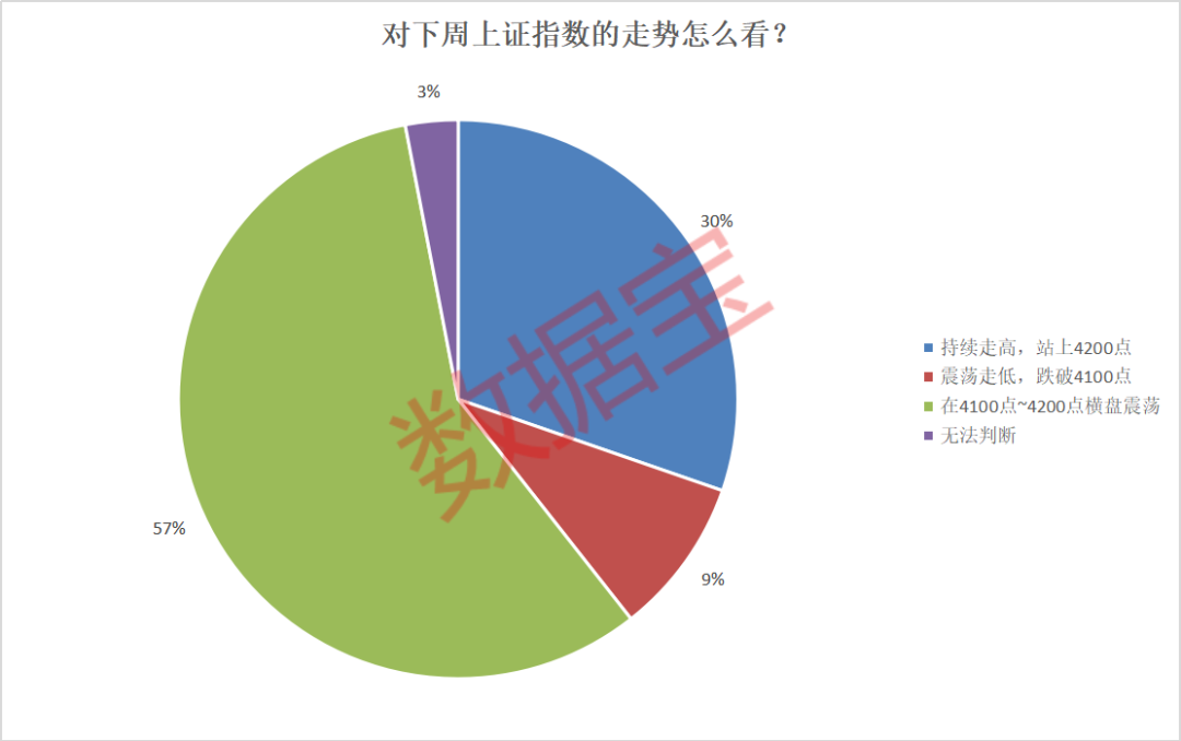 本周A股指数高位窄幅震荡,投资者对于接下来的市场走势态度暧昧,但整体偏积极。调查数据显示,57%的投资者认为下周市场将“在4100点~4200点横盘震荡”;30%的投资者认为下周市场将“持续走高,站上4200点”;仅有9%的投资者明确看空市场,表示下周市场将“震荡走低,跌破4100点”。