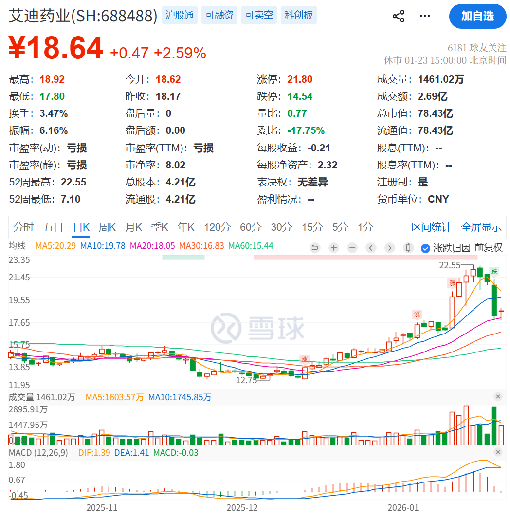 二级市场上,截至1月23日收盘,艾迪药业上涨2.59%报18.64元/股,总市值约78.43亿元,近一月来公司股价累计上涨约157%。