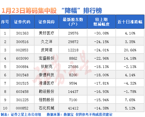 除了ST股外,股东户数降幅最多的是美好医疗,截至1月20日最新股东户数为29576户,较1月10日下降30.08%;其次是久之洋,截至1月20日最新股东户数为29872户,较1月10日下降24.15%。
