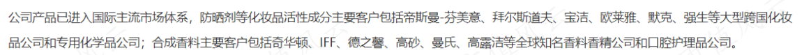它的客户名单堪称豪华,帝斯曼、拜尔斯道夫、宝洁、欧莱雅,全是响当当的国际日化巨头。甚至在合成香料领域,奇华顿、芬美意这些行业大佬也是它的座上宾。