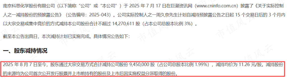 根据公告,公司实控人之一周久京先生,在2025年8月7日至11月期间,通过大宗交易减持了945万股,占总股本的1.99%。