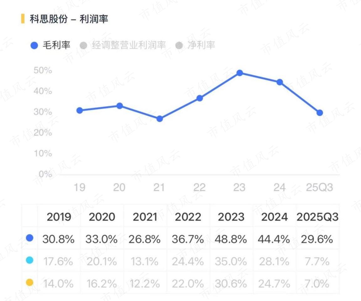 曾几何时,科思股份是著名的“现金奶牛”。2023年,它的综合毛利率高达48.8%,是妥妥的暴利生意。到了2024年,虽然微降至44.4%,依然傲视群雄。但到了2025年三季度,这个数字直接击穿了30%的心理防线,跌到了29.6%。