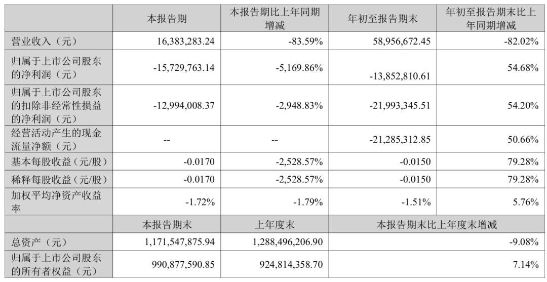 其中,公司第三季度营业收入为1638.33万元,同比下降83.59%;归母净利润为-1572.98万元,同比大降5169.86%。