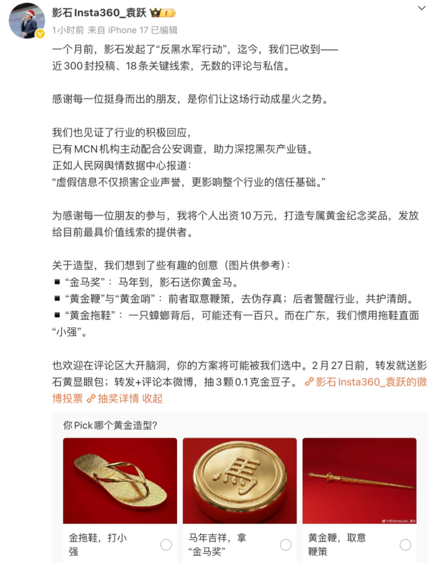 为持续净化网络环境,影石宣布升级线索征集活动:即日起,鼓励用户在公开平台发布帖子(图文/视频)或评论曝光针对“影翎”的黑水军行为,凭截图私信官方。若线索属首次被影石采纳,将额外发放与该帖或该评论点赞数等额的奖金。
