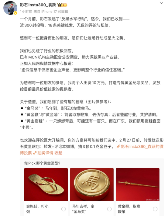 为持续净化网络环境,影石宣布升级线索征集活动:即日起,鼓励用户在公开平台发布帖子或评论曝光针对“影翎”的“黑水军”行为,凭截图私信官方。若线索属首次被影石采纳,将额外发放与该帖或该评论点赞数等额的奖金。