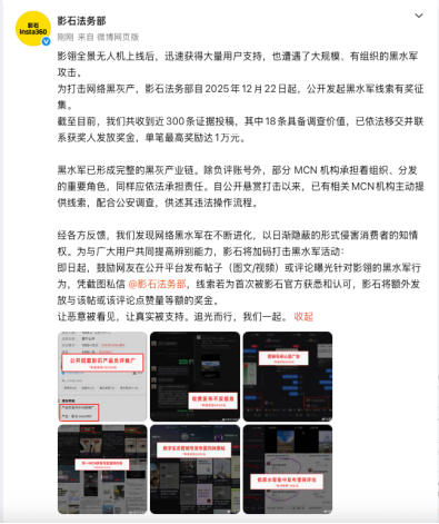 影石法务部表示,针对其新款无人机“影翎A1”的“黑水军”行为已形成产业链,包括公开招募发布负面内容、营销号有偿诋毁、MCN机构组织多账号发布雷同信息等。自公开悬赏以来,已有相关MCN机构主动提供线索,配合公安调查,供述其违法操作流程。