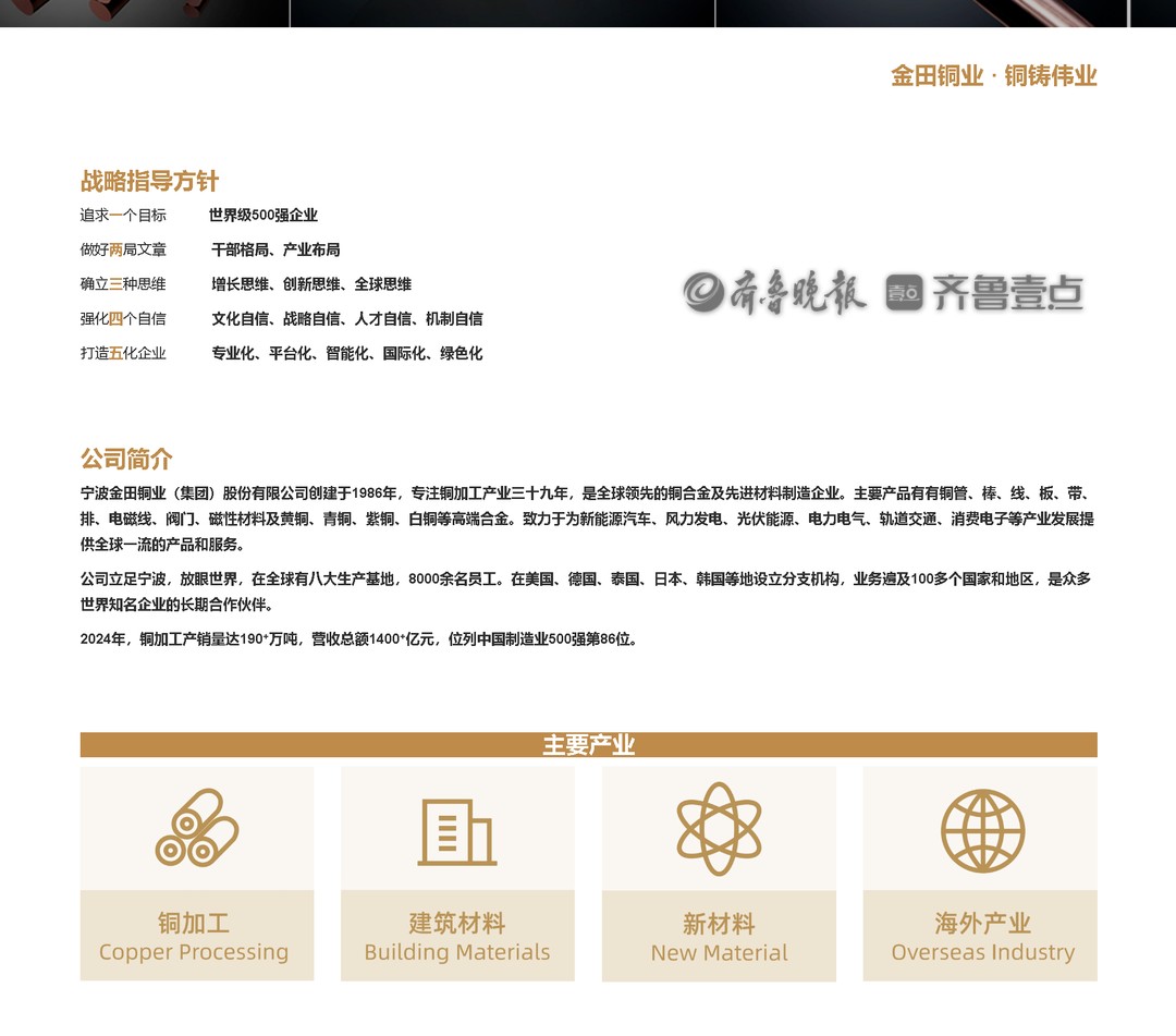 2024年,铜加工产销量达190 万吨,营收总额1400 亿元,位列中国制造业500强第86位。