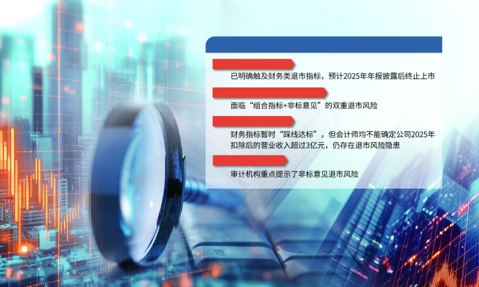 一方面,*ST春天、*ST沐邦已明确2025年净利润预计亏损,其年审会计师表示尚不能确定扣除后营业收入超过3亿元。*ST沪科预计2025年营业收入仅为750万元至1100万元,其年审会计师表示尚不能确定利润总额、扣非前后净利润均为正,均可能触及组合类财务退市情形。
