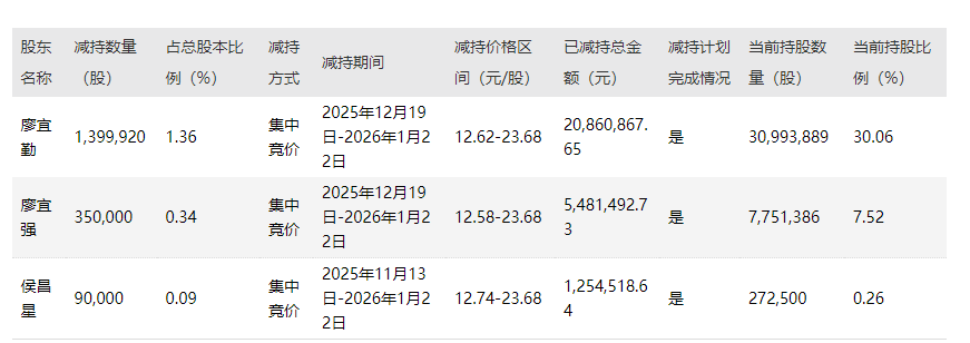 在公司股票连续大涨期间,核心股东完成减持计划。根据公告,1月21日至22日,控股股东、实际控制人廖宜勤,实际控制人廖宜强及高级管理人员侯昌星完成此前披露的股份减持计划,合计减持股份183.992万股,占公司总股本的1.79%,套现总金额约2759.69万元。