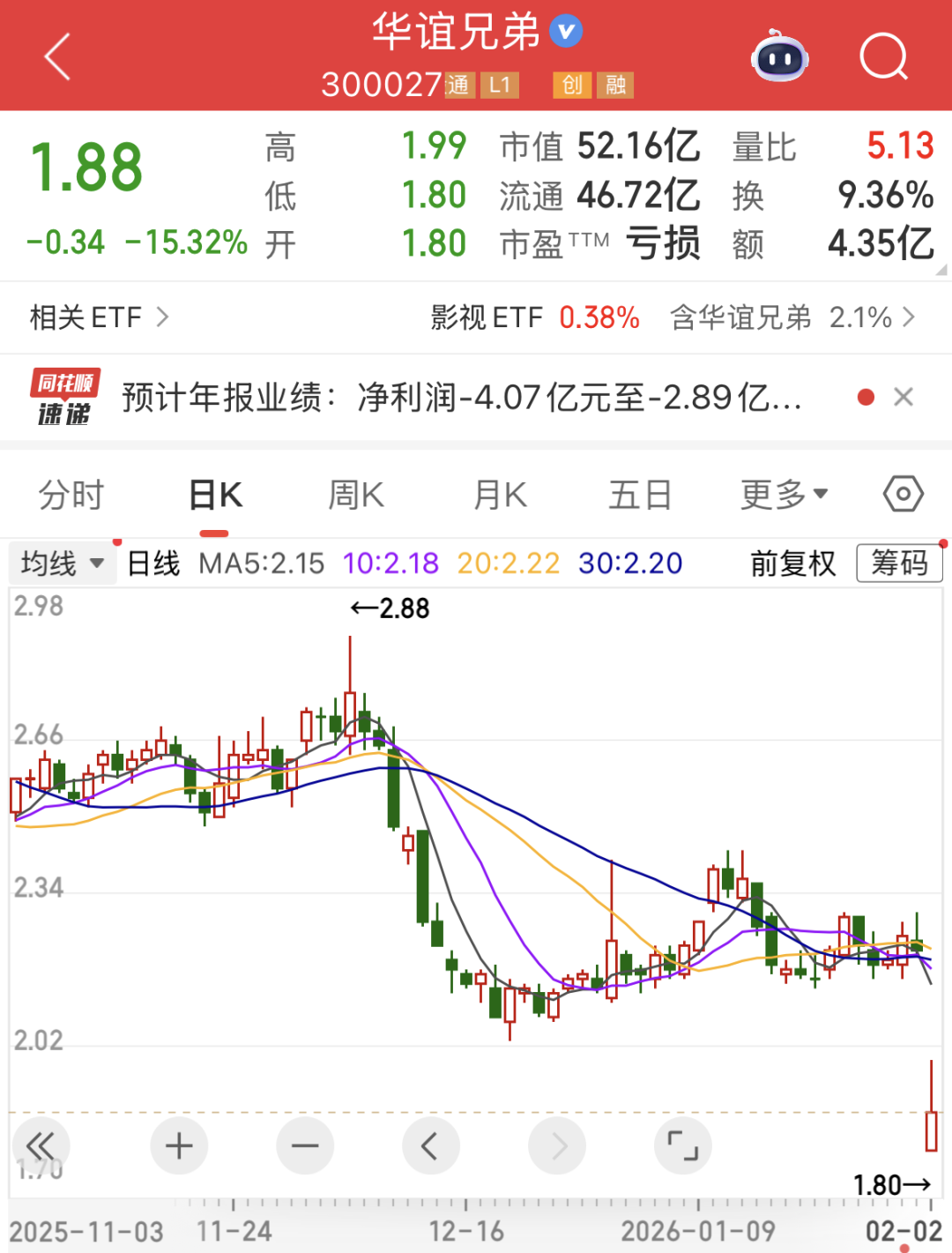 昔日电影巨头华谊兄弟(300027)(300027)开盘大跌,盘中最大跌幅达到18.92%,最新股价跌破2元/股,创近1年来新低。